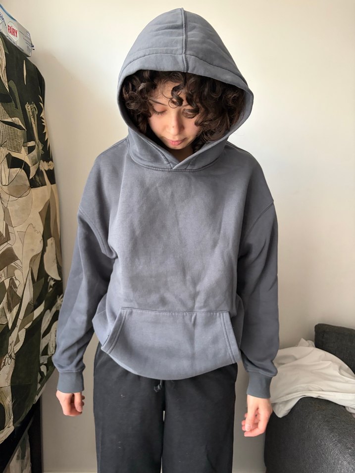 Yumuşak ve sıcak kumaştan, kapüşonlu ve uzun kollu, gri renkli, bol kesim kadın sweatshirtü.