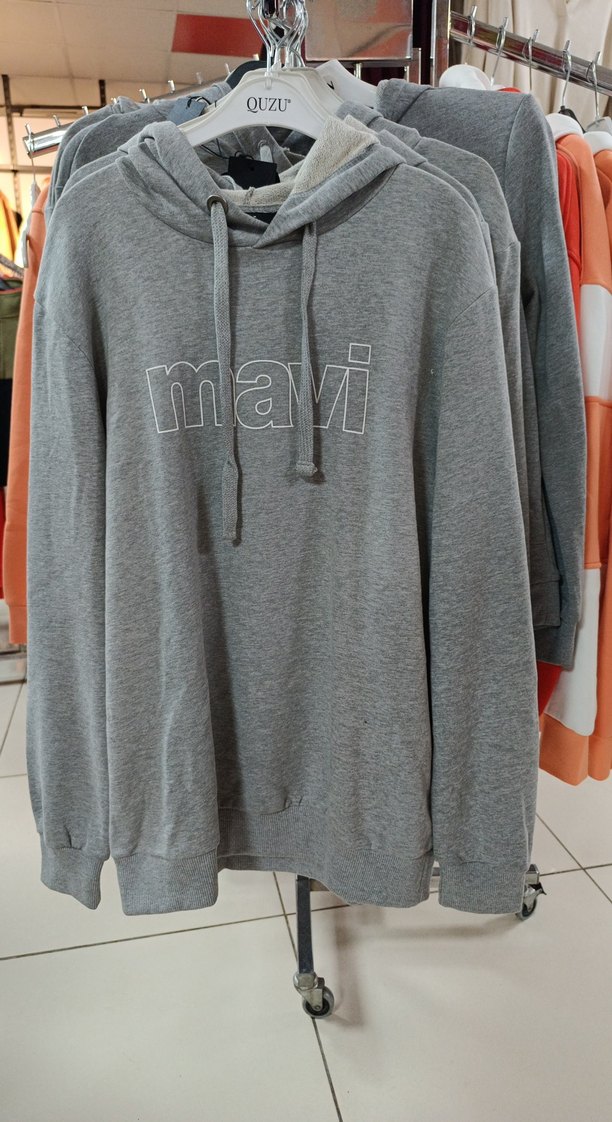 Gri renkte, uzun kollu ve kapüşonlu, rahat kesimli kadın sweatshirt. Önünde 'mavi' baskısı bulunur. Günlük kullanım ve sokak stiline uygun.