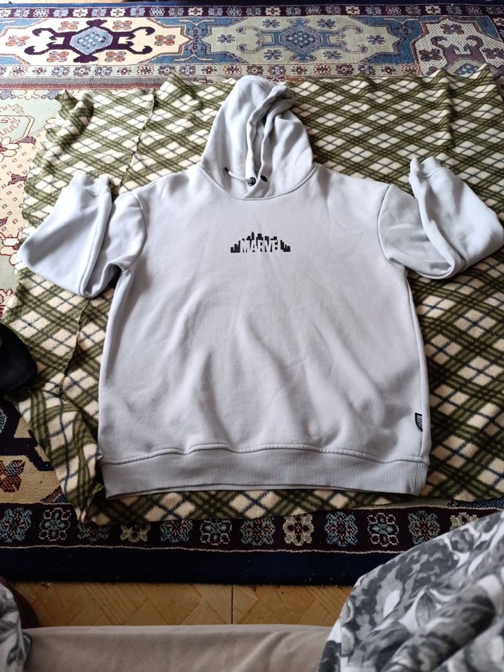 Gri renkli kapüşonlu sweatshirt, bol kesim ve uzun kolludur. Yumuşak ve sıcak kumaştan üretilmiştir. Günlük kullanıma uygun sade ve rahat bir tarza sahiptir.