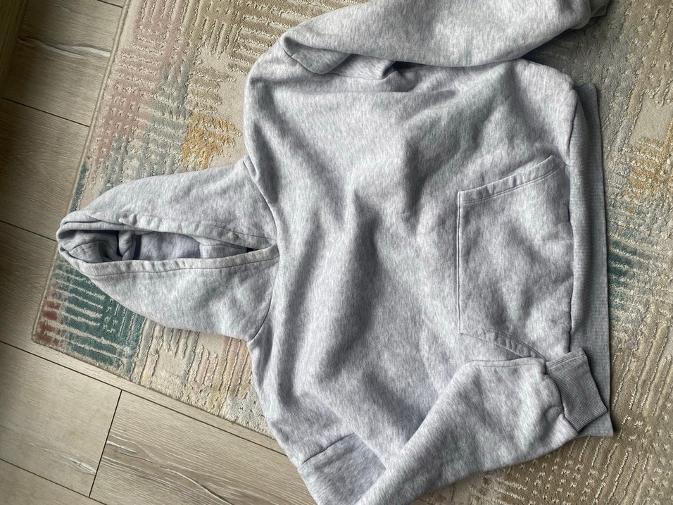 Gri kapüşonlu kadın sweatshirt, uzun kollu ve rahat kesimdir. Yumuşak keten kumaştan yapılmış, cepli ve desensizdir, günlük kullanım için konforlu ve şık.