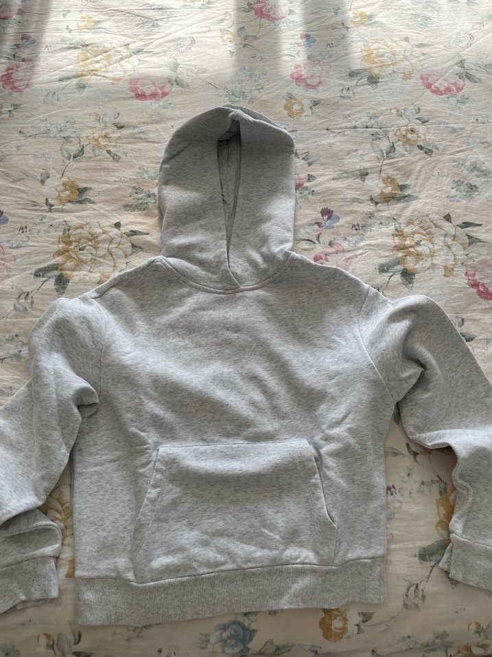 Gri kapüşonlu sweatshirt, uzun kollu ve bol kesim. Yumuşak ve sıcak kumaştan, ön cep detaylı, sade ve desensiz tasarım.