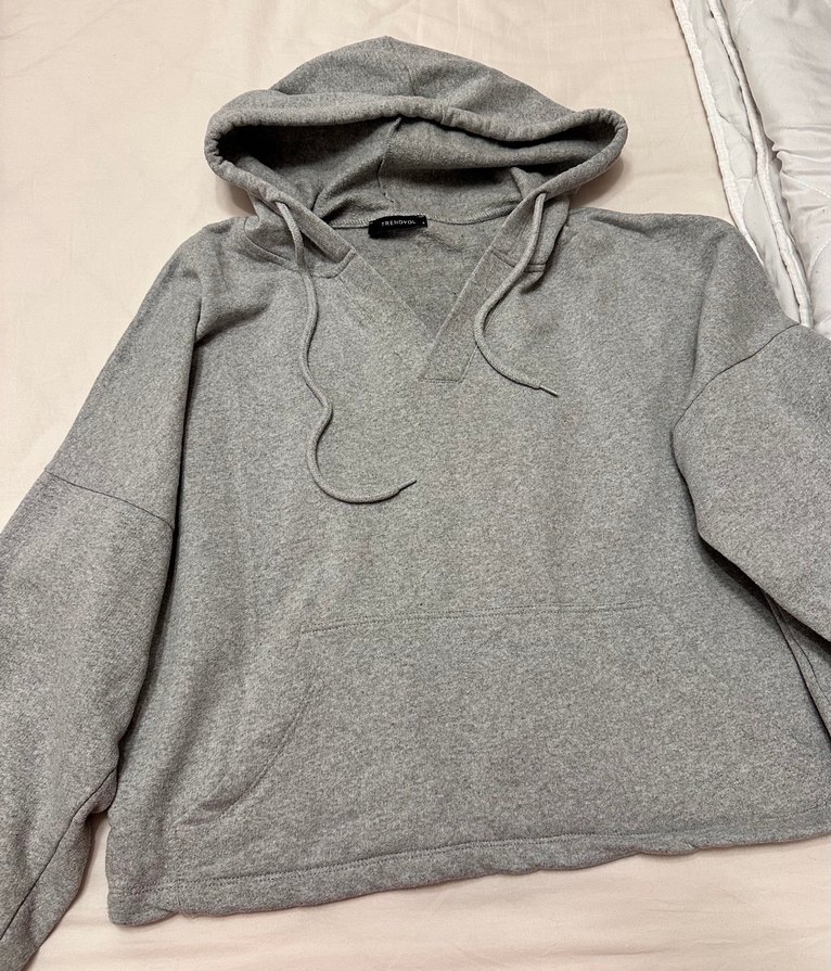 Gri, kapüşonlu ve uzun kollu, yumuşak ve sıcak kumaştan yapılmış bol kesim sweatshirt. Yuvarlak yaka ve desensiz sade tasarımıyla günlük rahat stil sunar.