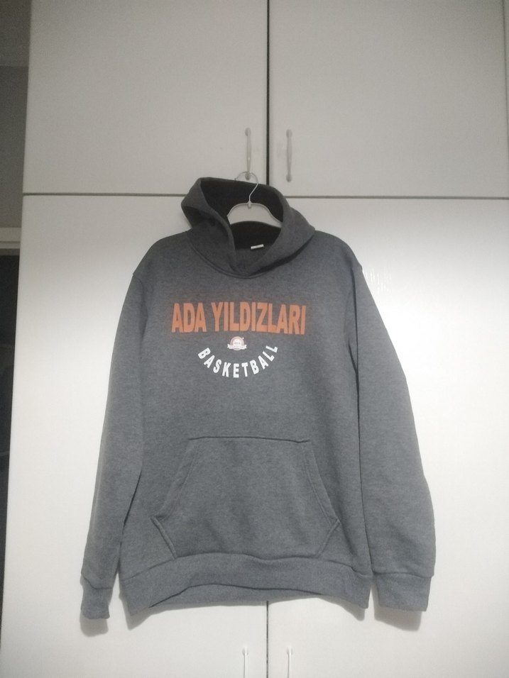 Gri kapüşonlu sweatshirt, yumuşak ve sıcak kumaştan, bol kesim ve uzun kollu. Önde cepli ve cırt cırtlı detaylı, 'ADA YILDIZLARI BASKETBALL' baskılı. Spor ve günlük kullanıma uygun.
