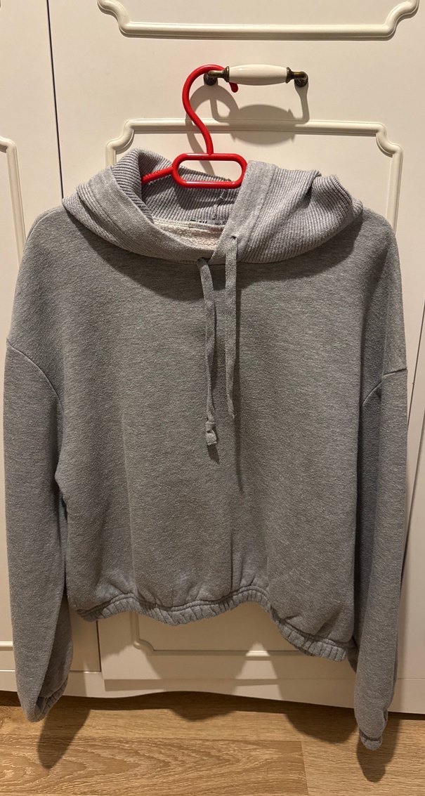 Gri renkte, kapüşonlu ve uzun kollu, örme detaylı kadın sweatshirt. Rahat kesimi ve normal boyu ile günlük kullanıma uygundur.