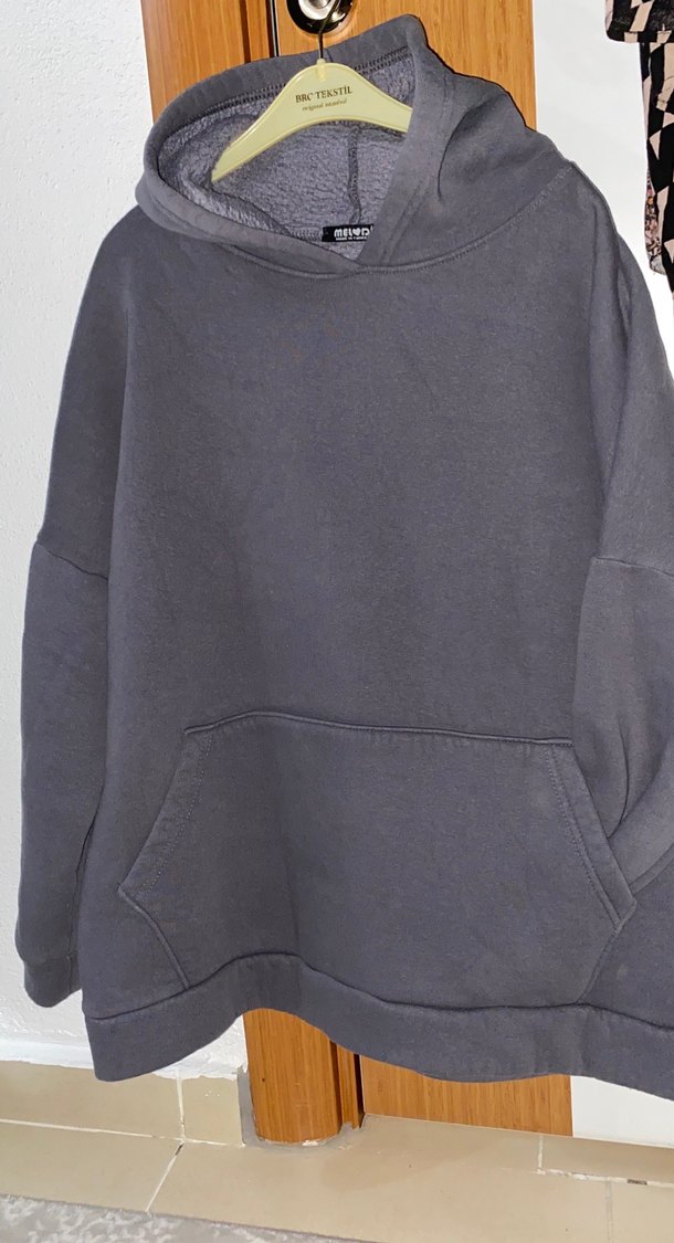 Uzun kollu, kapüşonlu ve bol kesim gri kadın sweatshirtü, yumuşak ve sıcak kumaştan üretilmiştir. Günlük kullanıma uygun, rahat ve şık bir sokak stili sunar.