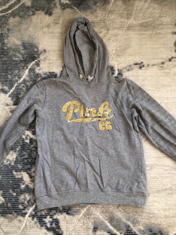 Gri kapüşonlu, uzun kollu sweatshirt. Rahat kesim ve yumuşak kumaş ile spor tarz için uygun. Xs ve s bedene uygundur kapüşonunda leke vardır evde giymeye uygundur