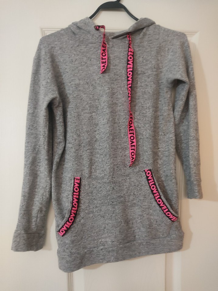 Gri renkli, kapüşonlu ve uzun kollu kadın sweatshirt. Rahat kesimi, fermuarlı cepleri ve pembe "LOVE" yazılı bağcıkları vardır. Yumuşak kumaştan üretilmiştir.