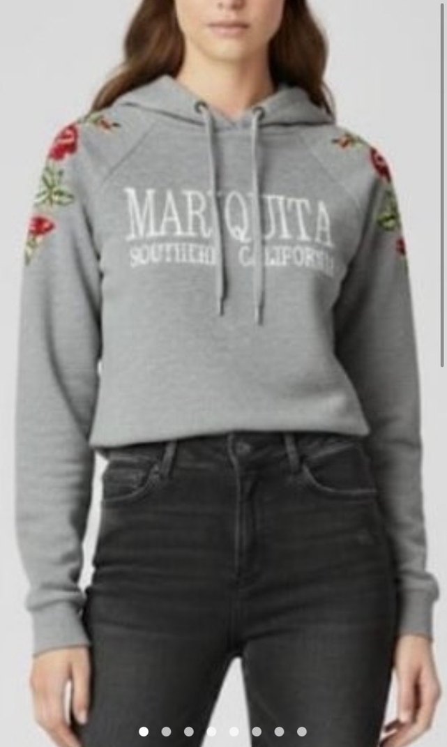 Gri kapüşonlu sweatshirt, uzun kollu ve bol kesimdir. Omuzlarda renkli çiçek nakışları ve yazılı baskı bulunur. Günlük kullanıma uygun rahat bir modeldir.