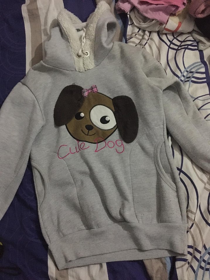 Uzun kollu, gri renkli, kapüşonlu ve bol kesim Kadın sweatshirt. Sevimli köpek baskısı ve kapüşonda kürk detayları bulunur.