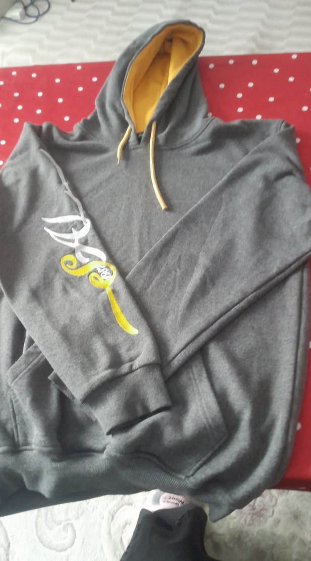 Gri renkte, kapüşonlu ve uzun kollu kadın sweatshirtü. Sarı kapüşon astarı ve baskılı detayları vardır. Rahat kesimi ve yumuşak kumaşıyla günlük kullanım için uygundur.