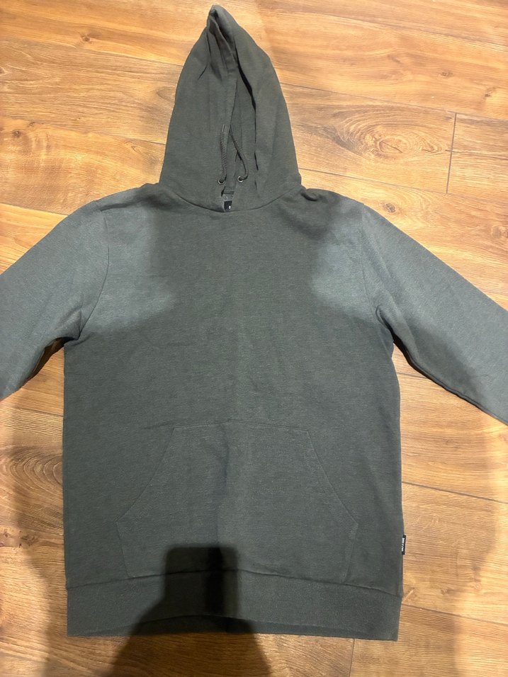 Gri renkli kadın sweatshirt, rahat kesim, uzun kollu ve bisiklet yaka. Yumuşak ve sıcak kumaştan kapüşonlu ve ön cepli, günlük kullanım için uygundur.