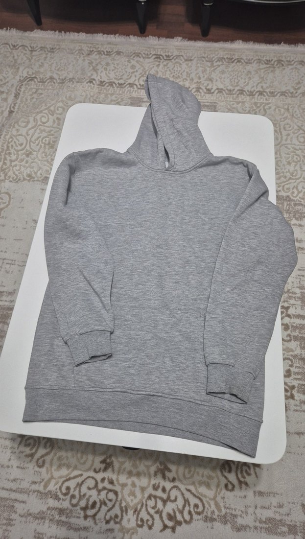 Gri kapüşonlu sweatshirt, uzun kollu ve bol kesimdir. Yumuşak ve sıcak kumaştan üretilmiş, günlük kullanım için uygundur.