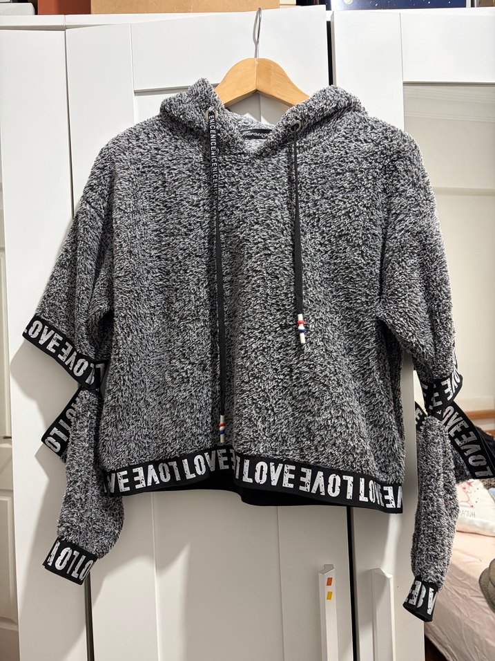 Gri renkli, kapüşonlu ve örgü dokulu kadın sweatshirtü. Bol kesim ve kısa boyda, uzun kollu. Manşet ve etek kısmında 'LOVE' baskılı siyah bantlar bulunur.