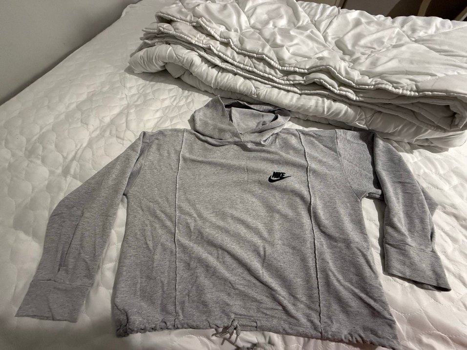 Gri renkte, uzun kollu ve yuvarlak yakalı kadın sweatshirt. Rahat kesimi ve yumuşak keten kumaşıyla spor ve günlük kullanıma uygun, desen içermeyen tasarım. Nike logosu detaylı. ♀️