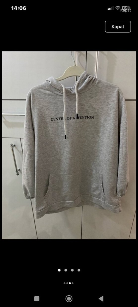 Gri pamuklu, kapüşonlu ve uzun kollu bol kesim sweatshirt. Önde baskılı yazı ve düğme detayı bulunur. Günlük kullanım için rahat.
