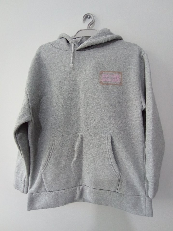 Gri kapüşonlu sweatshirt, uzun kollu ve bol kesim. Yumuşak ve sıcak kumaştan, rahat ve günlük kullanım için uygun.