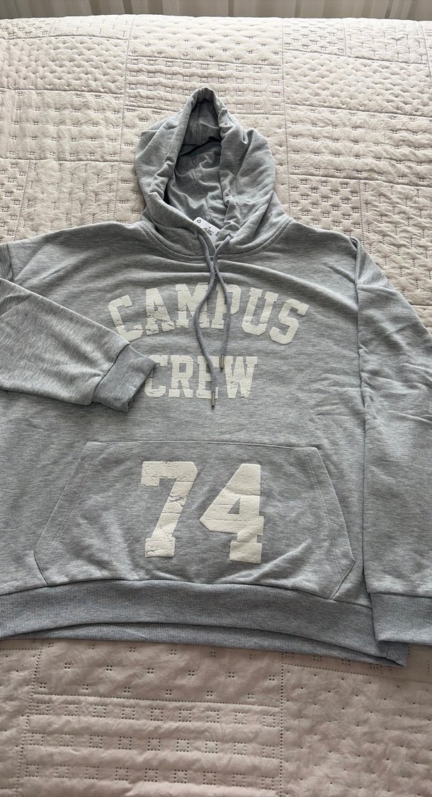 Gri renkli, kapüşonlu ve uzun kollu kadın sweatshirtü. Yumuşak kumaştan, baskılı "Campus Crew 74" desenli. Rahat ve salaş kesim, spor ve şehir stili için uygundur. (Kol arası 64cm, alt bel 91cm)