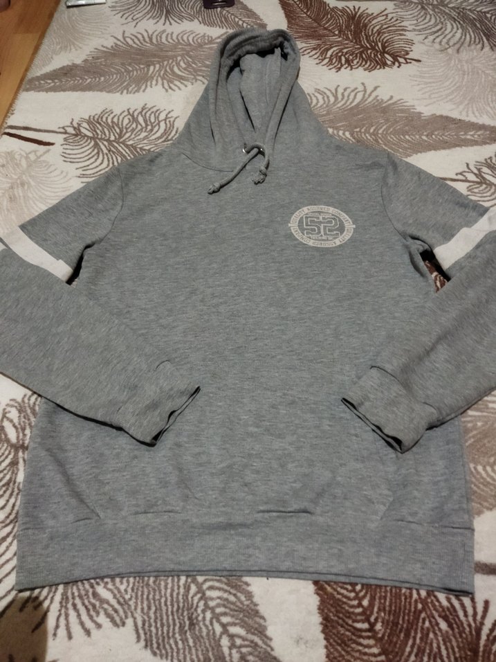 Gri kapüşonlu, uzun kollu kadın sweatshirt. Yumuşak kumaştan, baskılı detaylı ve fermuarlı, rahat kesimle günlük kullanıma uygun. az kullanılmış ölçüler görsellerde mevcut l xl beden uyumlu