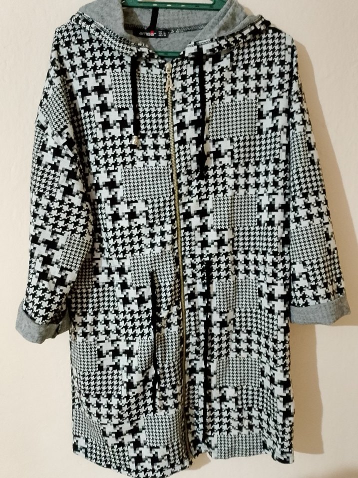Gri desenli uzun kadın ceket, kapüşonlu ve önden fermuarlı. Uzun kollu ve bol kesim, rahat sokak stili için uygundur.