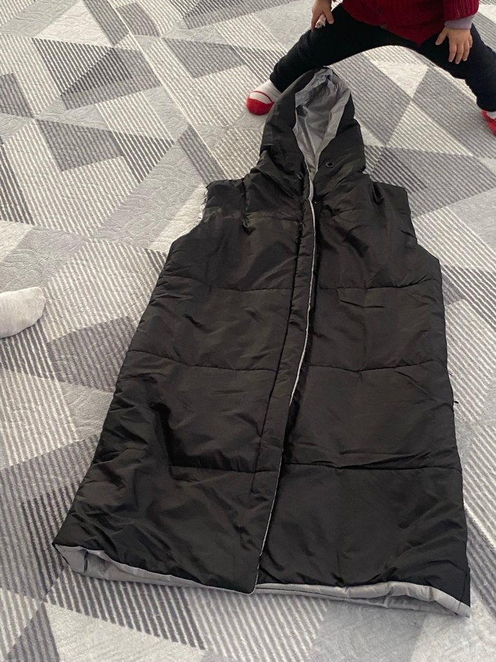 Yüksek yakalı, kapüşonlu ve fermuarlı kadın yeleği. İnce kesim, midi boy ve yumuşak, sıcak kumaştan üretilmiştir. Gri renkte, desen içermeyen rahat sokak stili yelek.