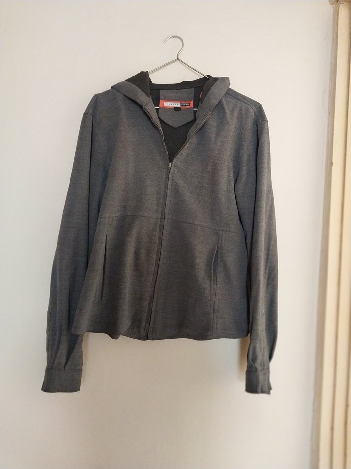 Yumuşak ve sıcak kumaştan yapılmış, yüksek yakalı ve fermuarlı gri ceketi. Uzun kollu ve rahat bir kesime sahiptir.