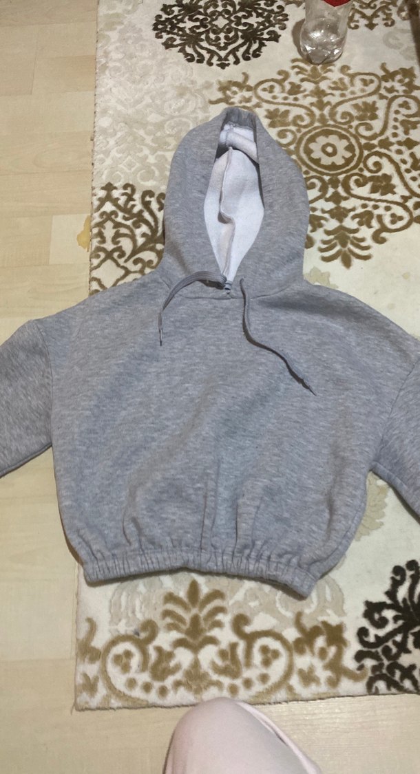 Gri kapüşonlu sweatshirt, uzun kollu ve bol kesimdir. Kısa boyu ve yumuşak örme kumaşıyla rahat ve gündelik kullanım için uygundur. Beli lastiklidir S m bedendir