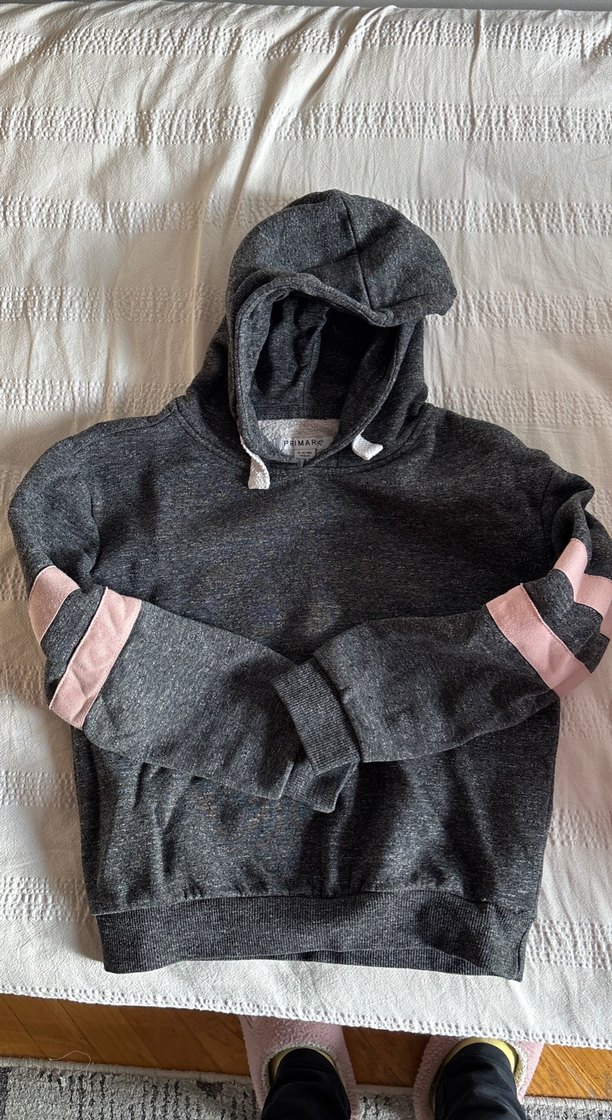Yumuşak kumaştan, pembe örgü çizgili uzun kollu, gri kapüşonlu ve dar kesim kadın sweatshirt. Günlük kullanım için uygundur.