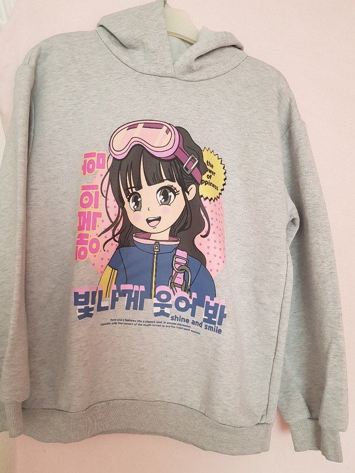 Gri renkli, uzun kollu ve rahat kesimli kız sweatshirtü, önünde baskılı anime tarzı grafik ve yumuşak örme polar kumaş ile rahat bir sokak giyim parçası. Bir iki kez kullanılmış hata kusur yok