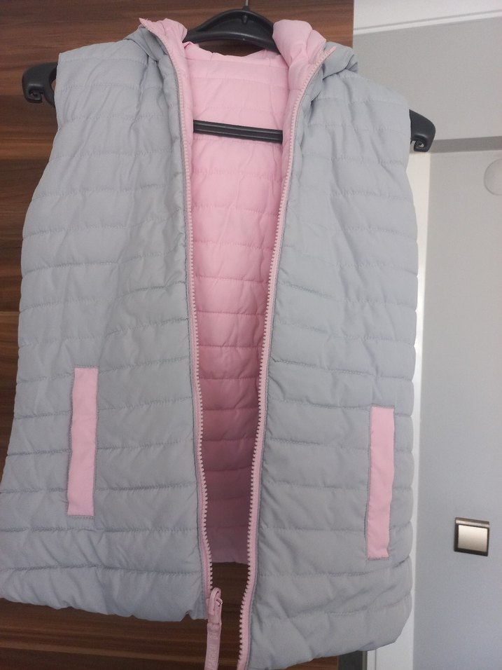 Gri kapüşonlu, fermuarlı kız yeleği, pembe detaylara sahip. Kolsuz, dar kesim ve sentetik kumaştan üretilmiştir. Sokak modasına uygun.