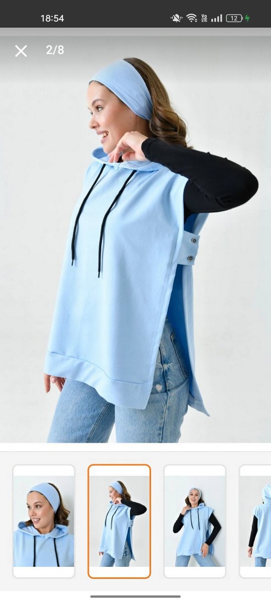 bebe mavisi renkte, kapüşonlu ve kolsuz, yüksek yakalı, bol kesim sweatshirt. Pürüzsüz sentetik kumaştan, gündelik sokak stili için uygun. yanları yırtmaçlı yandan düğmeli çok az kullanıldı deforme yok trendyoldan aldım