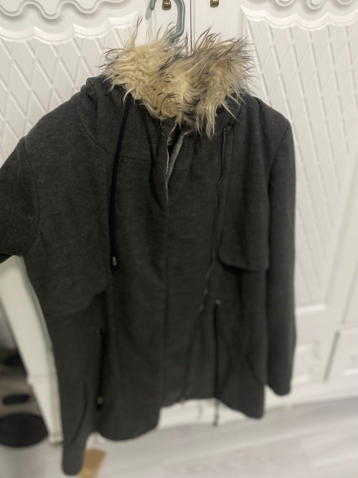 Gri renkte, kapüşonlu ve kürk detaylı kadın ceketi. Yumuşak ve sıcak kumaştan, uzun kollu ve bol kesimdir. Midi boyda, desen içermeyen rahat bir dış giyimdir.