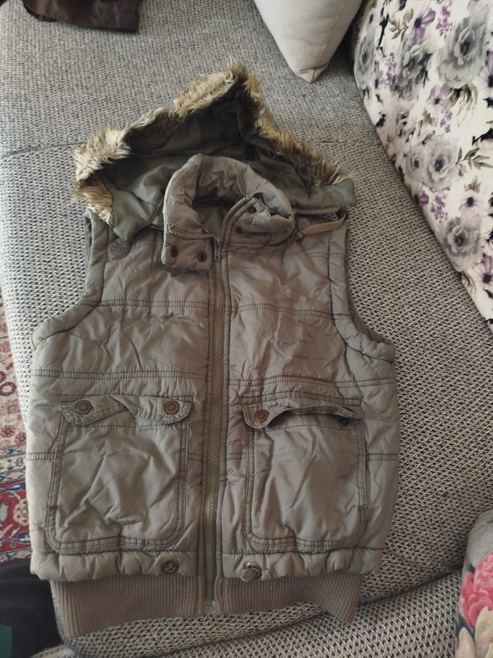 Gri renkte, kapüşonlu ve kürk detaylı, cepli, yumuşak sentetik kumaştan yapılmış, dar kesim kadın yelek.