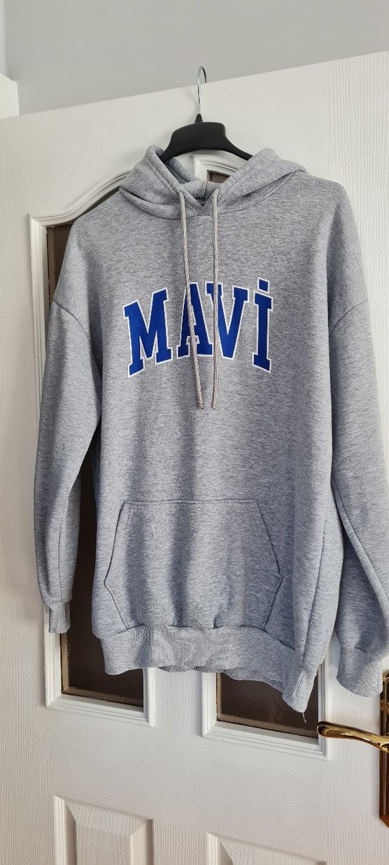 Gri kapüşonlu sweatshirt, önünde MAVİ baskısı ile rahat ve bol kesimdir. Yumuşak, örme tüylü kumaştan yapılmıştır, günlük rahat kullanım için idealdir. Uzun kollu ve normal boydadır.