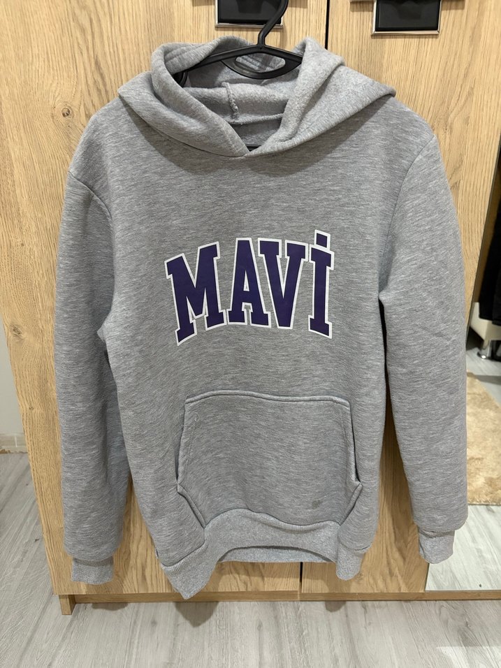Gri kapüşonlu sweatshirt, bol kesim ve yumuşak, sıcak kumaş ile MAVİ baskısına sahiptir. Uzun kollu ve ön ceplidir, spor ve rahat kullanım için uygundur. 34-36 beden uyumludur.