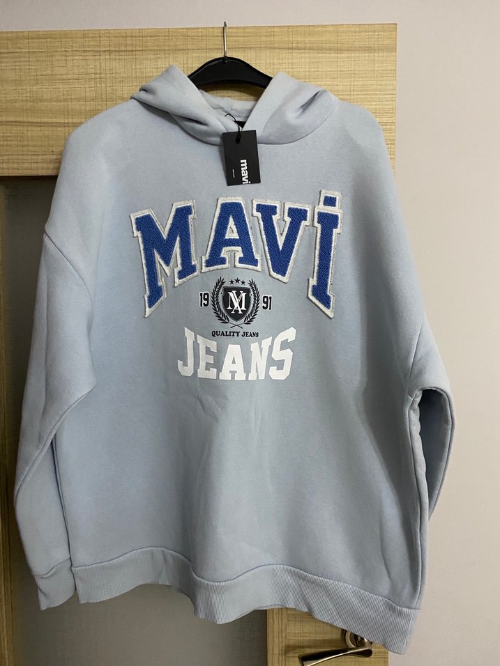 Gri kapüşonlu sweatshirt, bol kesim ve uzun kolludur. Yumuşak denim kumaştan yapılmış, önünde MAVI JEANS baskısı ve örme dokusu vardır. Sokak stiline uygundur.