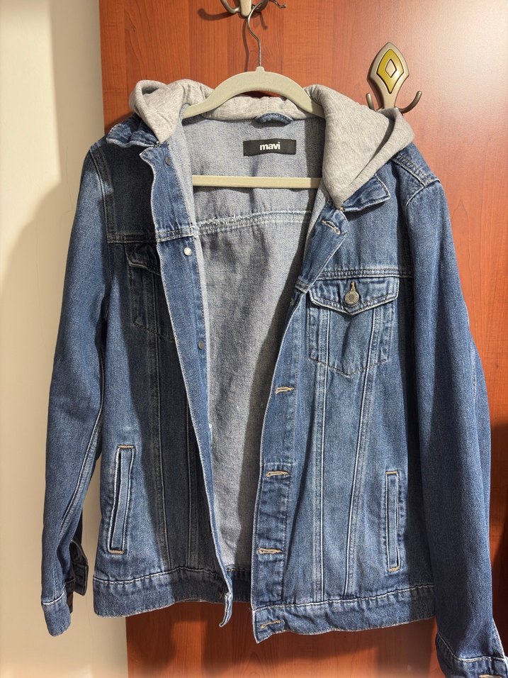 Gri kapüşonlu astarlı, düğmeli, bol kesim mavi Kot denim ceket. Uzun kollu ve yaka detaylı, günlük kullanıma uygundur.