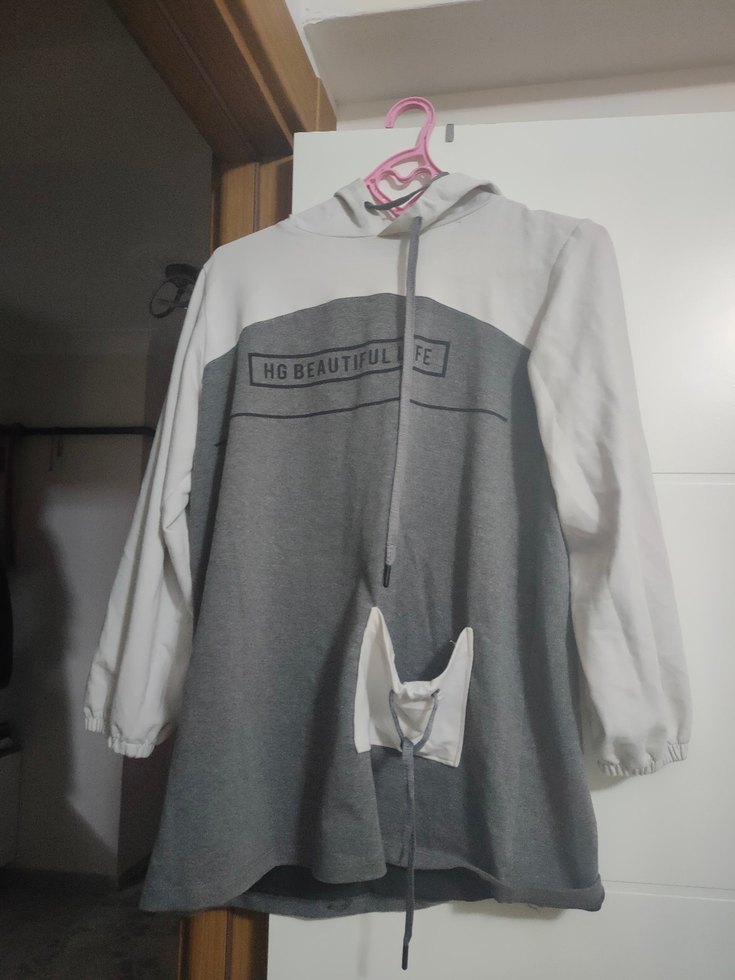 Gri renkte, uzun kollu, kapüşonlu midi sweatshirt. Bel detayı ve baskılı tasarımıyla rahat bir görünüm sunar. Günlük kullanım için uygundur.
