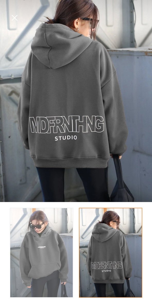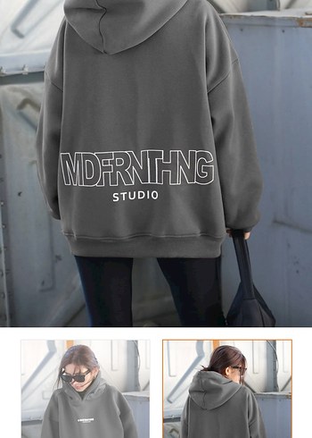 Gri renk, bol kesim, yuvarlak yaka ve uzun kollu, yumuşak örme kumaştan sweatshirt. Sırtında "MDFRNTHNG STUDIO" baskısı bulunur, günlük sokak stili için uygundur.