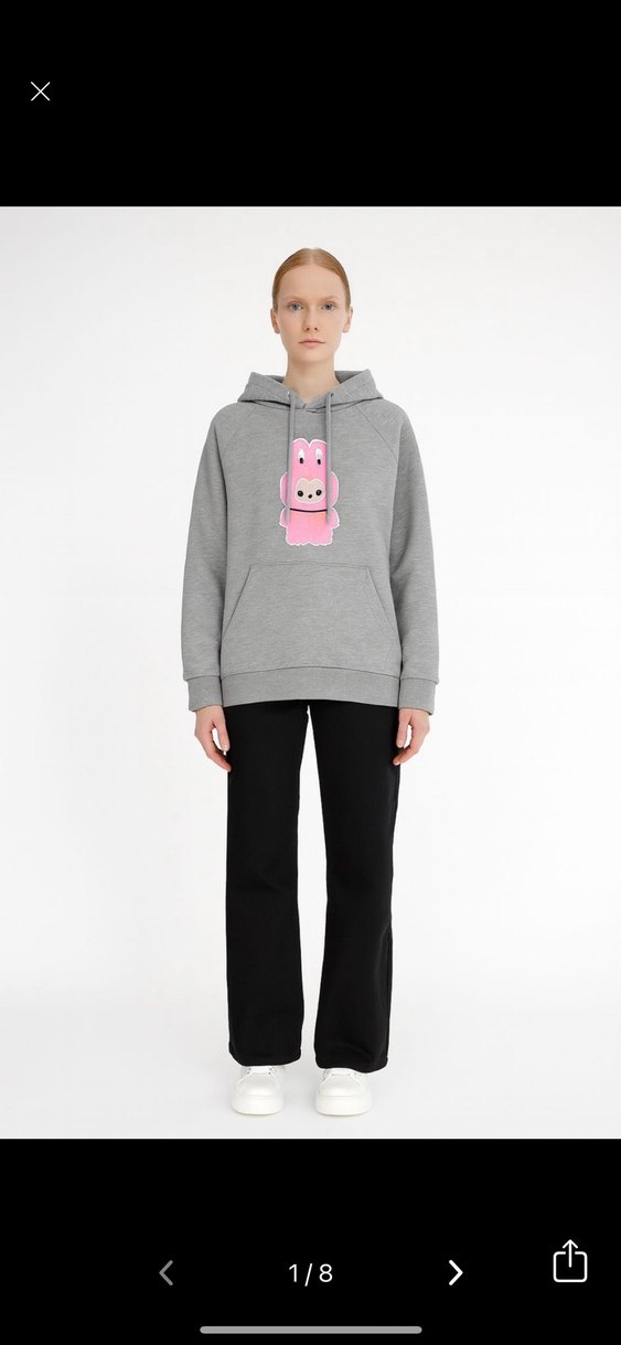 Gri renkli, nakış, kapüşonlu ve kanguru cepli, uzun kollu, rahat kesim kadın sweatshirtü. kol altı 50 boy62 cm. şardonlu