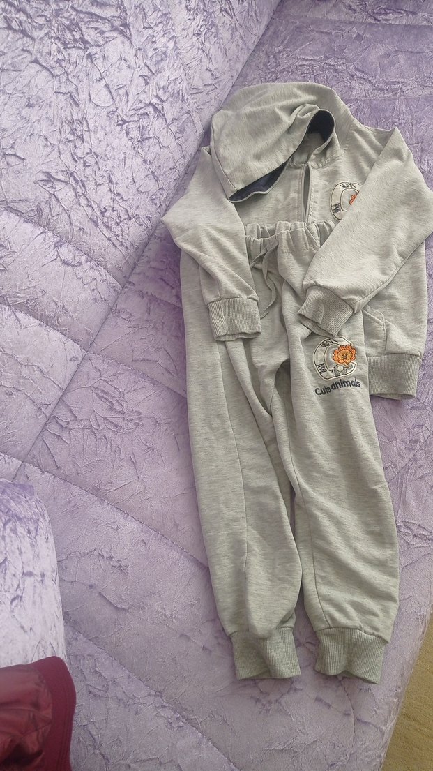 Yumuşak kumaştan, kapüşonlu ve uzun kollu, bol kesim gri çocuk eşofmanı.