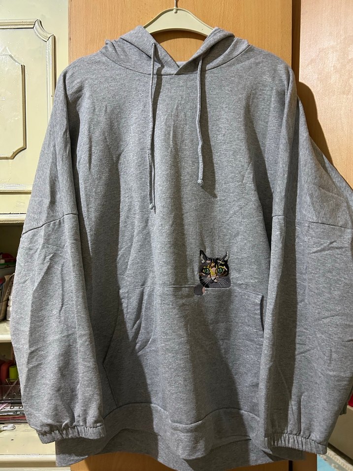 Gri kadın sweatshirt, uzun kollu, kapüşonlu ve bol kesimdir. Yumuşak kumaştan, nakışlı kedi detayı bulunur.