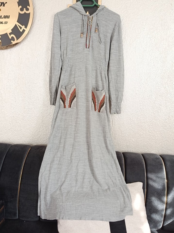 Gri renkte, kapüşonlu ve uzun kollu triko elbise. Nakış detaylı, bol kesim ve önünde iki cep bulunur. Günlük kullanım için uygundur.