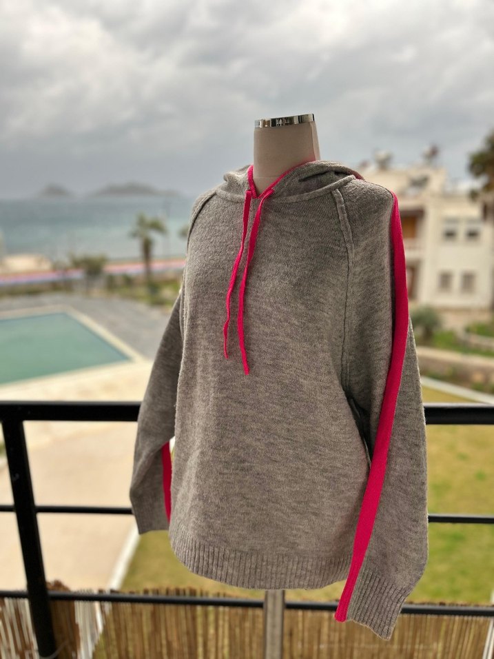 Gri triko kumaştan, kapüşonlu ve pembe neon ip detaylı, uzun kollu, bol kesim ve normal boyda kadın sweatshirt
