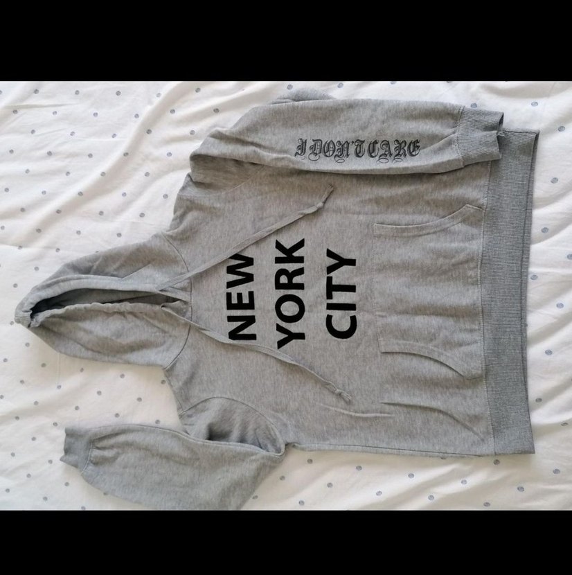 Gri kapüşonlu sweatshirt, uzun kollu ve bol kesimdir. Önünde 'NEW YORK CITY', kolunda 'IDONTCARE' baskısı vardır. Yumuşak ve sıcak kumaştan üretilmiştir. ️Koton sweatshirt. birkaç kez giyildi sorunsuz