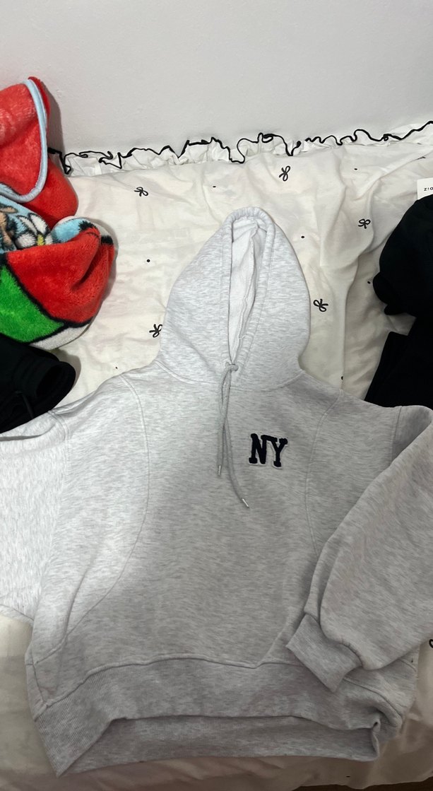 Gri kapüşonlu sweatshirt, bol kesim ve uzun kollu, yumuşak kumaştan. "NY" baskılı, normal boyda, günlük rahat kullanım için uygun.