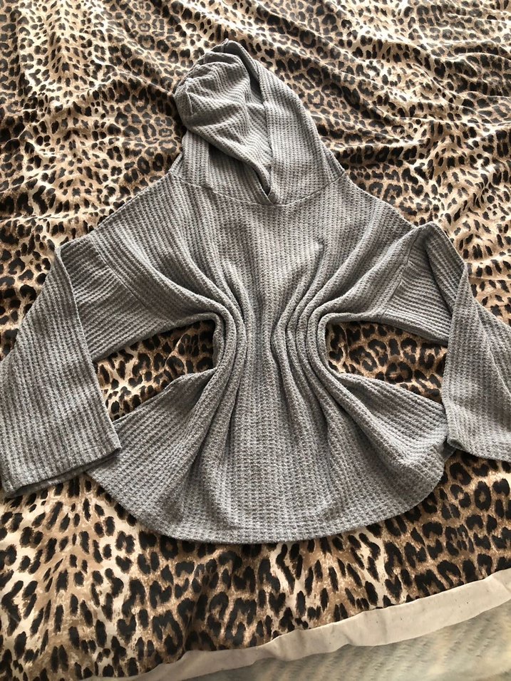 Gri renk, uzun kollu ve kapüşonlu örgü kazak, rahat ve salaş kesimiyle günlük sokak stiline uygun. Normal midi boyda ve desensizdir.