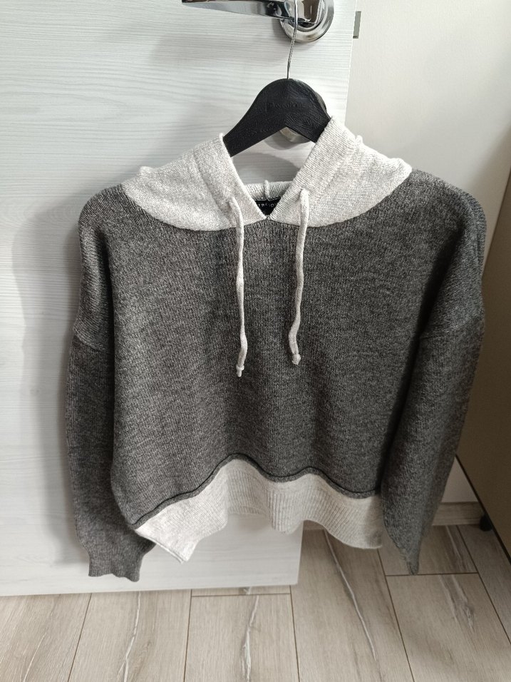Gri ve beyaz renklerde, uzun kollu ve bol kesim kadın örgü sweatshirt. Kapüşonlu ve bisiklet yaka, günlük sokak stili için uygun. çok az kullanıldı deformesi yok
