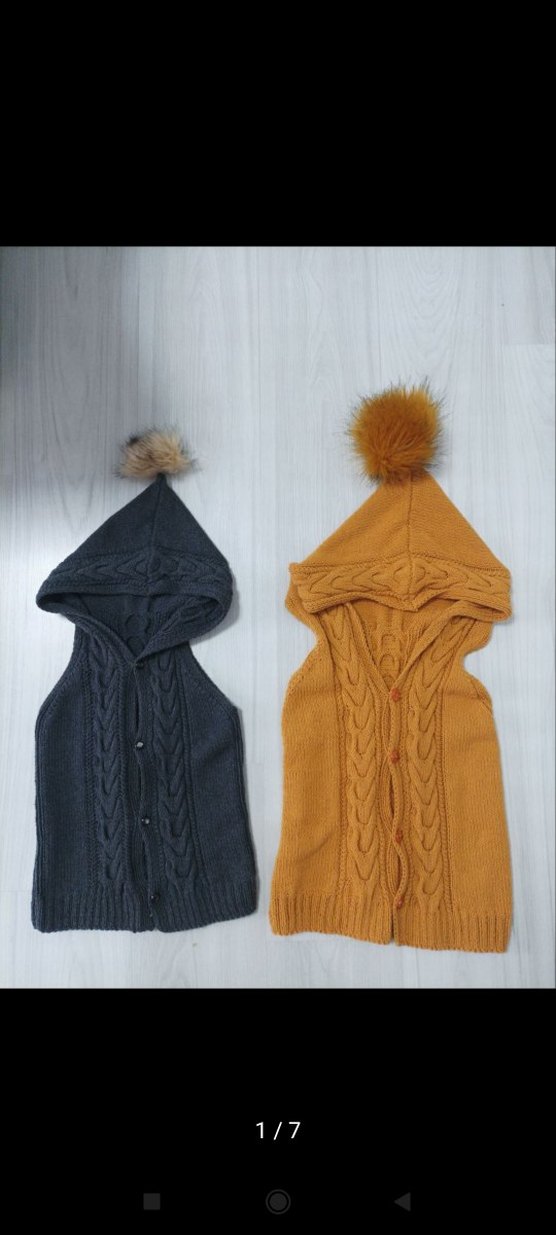 Gri renkli, örgü kumaştan yapılmış, bohem tarzda, işlemeli detaylı ve ponponlu kapüşonlu dar kesim kolsuz süveter.