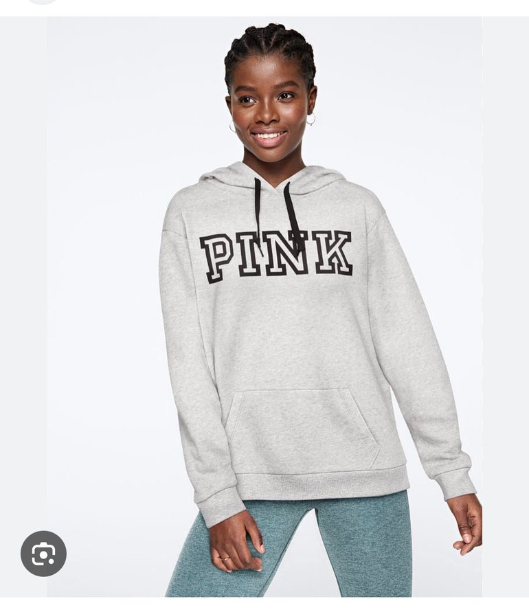 Gri, uzun kollu, kapüşonlu ve bol kesim sweatshirt, 'PINK' baskılı, yumuşak ve sıcak kumaştan. Rahat athleisure tarz için uygundur. ♀️