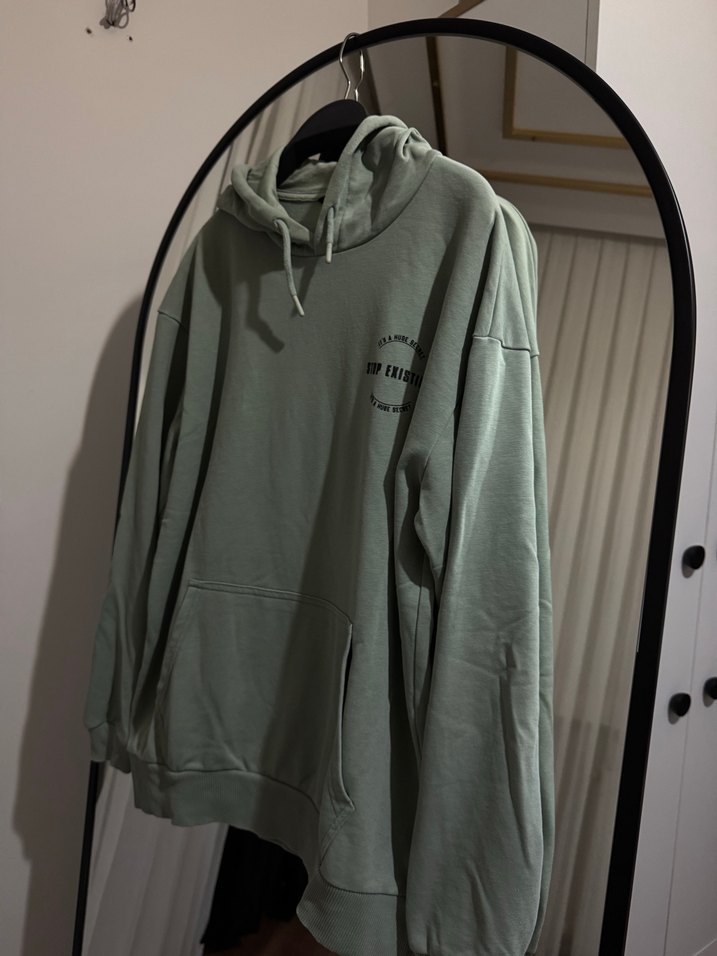 Uzun kollu, kapüşonlu ve baskılı gri oversize sweatshirt, rahat ve günlük kullanım için cepli.